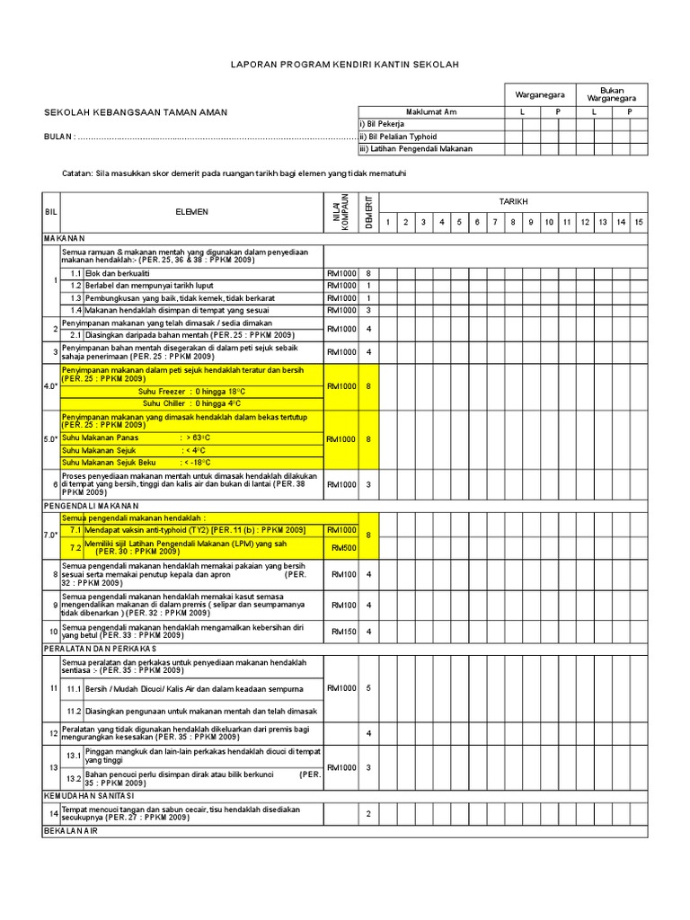 Borang soal selidik borang pemerhatian surat pengesahan soal selidik kesahan soal selidik (nilai alpha cronbach) surat akuan pelajar surat kebenaran daripada bahagian perancangan dan penyelidikan dasar pendidikan surat kebenaran daripada jabatan pendidikan negeri johor. Mukasurat 2 daripada 2 borang penilaian bulanan kebersihan kantin / dapur asrama warga bukan warga negara negara premis Borang kendiri kantin kosong punya.xls. Bagi peringkat awal di permulaan tahun, guru perlu membuat penilaian kendiri iaitu menilai sendiri diri guru terhadap proses pembelajaran dan pemudahcaraan yang dilaksanakan di dalam kelas. Dapatkan dari majalah, surat khabar, klinik kesihatan, hospital dan sebagainya isi borang pemantauan pemantauan berdasarkan garis panduan laporan kendiri kantin.