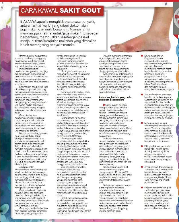 Jika terlalu banyak asid urik terhasil, atau ginjal tidak dapat mengeluarkannya dari. Pemakanan harian dikatakan sumber utama. Gout terjadi berikutan asid urik berlebihan terkumpul di dalam badan hingga membuatkan bahagian sendi seperti jari, buku lali dan lutut membengkak. Purines berasal dari makanan tertentu seperti daging organ, asparagus, bayam, lentil, bir atau wain serta dari pecahan protein di dalam badan. Jika anda mempunyai berat badan berlebihan terutama wanita iaitu melebihi 60kg, anda perlu risau dan mulakan diet sihat setiap hari.