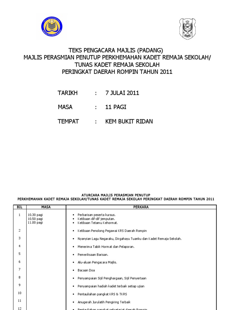 Bagi memastikan majlis berjalan dengan lancar, hadirin diingatkan agar mematikan atau memastikan telefon bimbit berada dalam pengaturcaraan senyap. Use the download button below or simple online reader. Teks pengacara majlis mesy agung pkj 2011. Teks pengacara mjlis kem jati diri pengawas 2014. Membawakan dari auditorium seri perdana ,pertandingan pidato peringkat daerah jasin melaka bandaraya bersejarah. Apabila diumumkan ketibaan para tetamu jemputan. Teks pengacara majlis, mc untuk majlis sambutan maulidur rasul peringkat sekolah menengah dan rendah. Teks pengacara majlis perasmian sambutan bulan kemerdekaan. Contoh teks terbaik dan lengkap dari mula program sehingga akhir penutup. Teks pengacara majlis program motivasi kecemerlangan tahun 6 2015 dijemput para hadirin untuk duduk. Mengumumkan ketibaan yang diraikan en. 16 & 17 februari 2011 ( 2 hari ). Teks pengacara majlis perpisahan en.