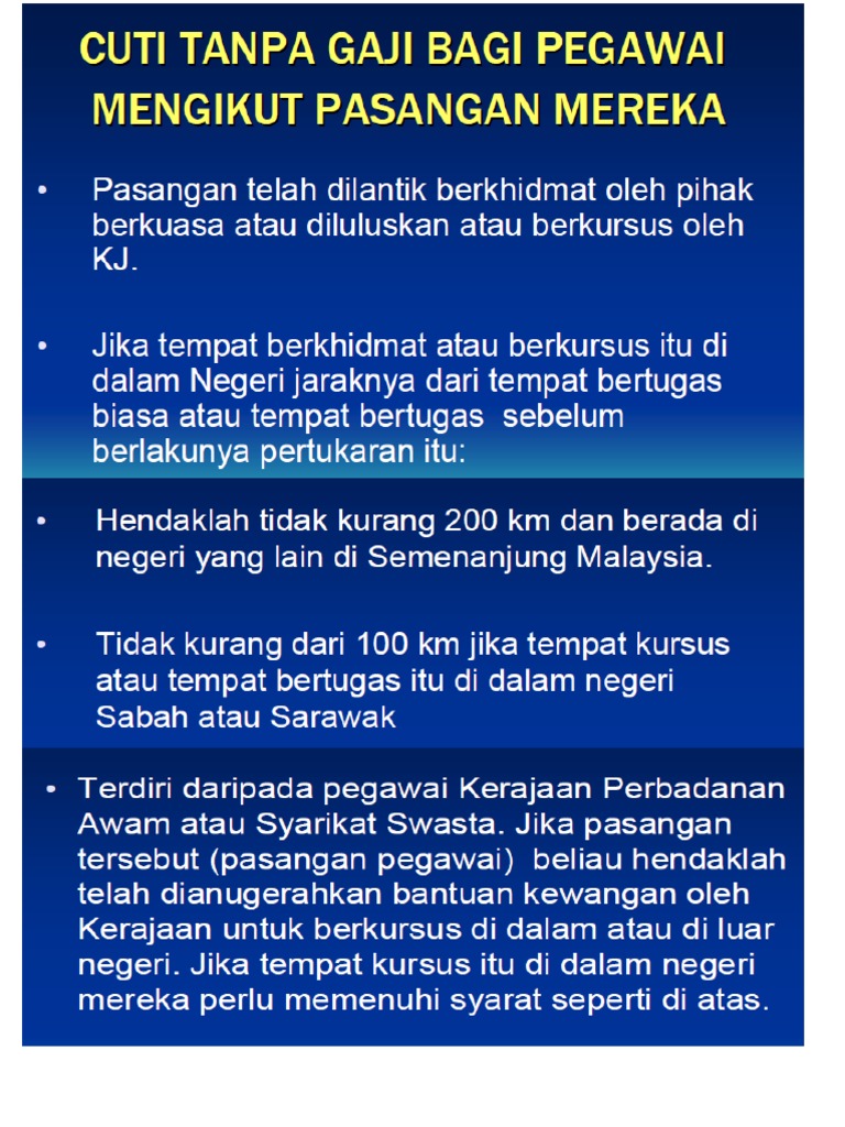 Permohonan Cuti Tanpa Gaji Mengikut Pasangan from img.yumpu.com Anda sebenarnya dah penat dan letih. Mengikut pasangan bertugas/berkhidmat/ berkursus dalam/luar negeri (pp bil. Bagi maksud tempoh notis peletakan jawatan, cuti tanpa gaji boleh diambil kira sebagai tempoh notis berdasarkan pekeliling perkhidmatan bilangan 1 tahun 2015 (pp bil 1/2015) dasar dan prosedur. Adakah tempoh cuti tanpa gaji boleh diambil kira sebagai tempoh notis peletakan jawatan staf? Surat kebenaran diluluskan cuti tanpa gaji mengikut pasangan di bawah pekeliling perkhidmatan bilangan 14 tahun 2005 selama 3 tahun mulai hingga atau hingga kembali ke malaysia mengikut mana yang terlebih dahulu. 2.10 jenis cuti yang diluluskan ( sekira berkursus ). Kenapa mahu cuti tanpa gaji? 1 gaji umr jawa barat dan gaji umr pangandaran 2021.